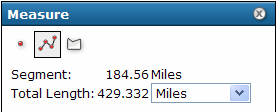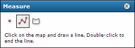 - Para borrar la línea del mapa, haga clic en cualquiera de los iconos de tipo de medición en el cuadro de diálogo Medir. Si hace clic en cualquier otra herramienta en la barra de herramientas, se cerrará el cuadro de diálogo Medir y también se borrará cualquier línea o polígono.