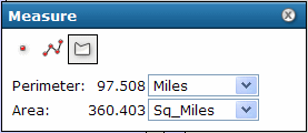 - Para borrar el polígono del mapa, haga clic en cualquiera de los iconos de tipo de medición en el cuadro de diálogo Medir. Si hace clic en cualquier otra herramienta en la barra de herramientas, se cerrará el cuadro de diálogo Medir y también se borrará cualquier línea o polígono.